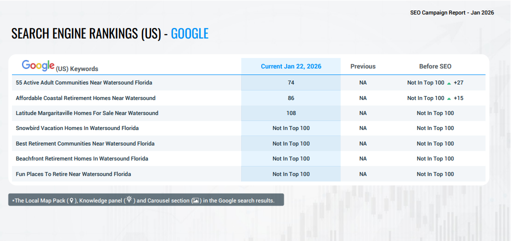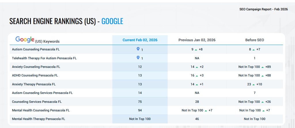 Ranking higher requires a strong keyword strategy, optimized service pages, technical website health, consistent content, backlink authority, and Google Business optimization. SEO is not one task. It is a coordinated strategy over time.